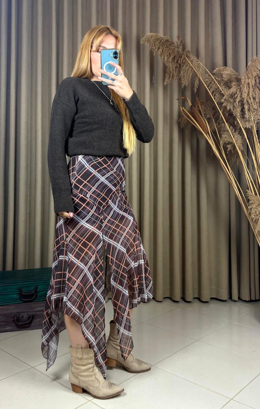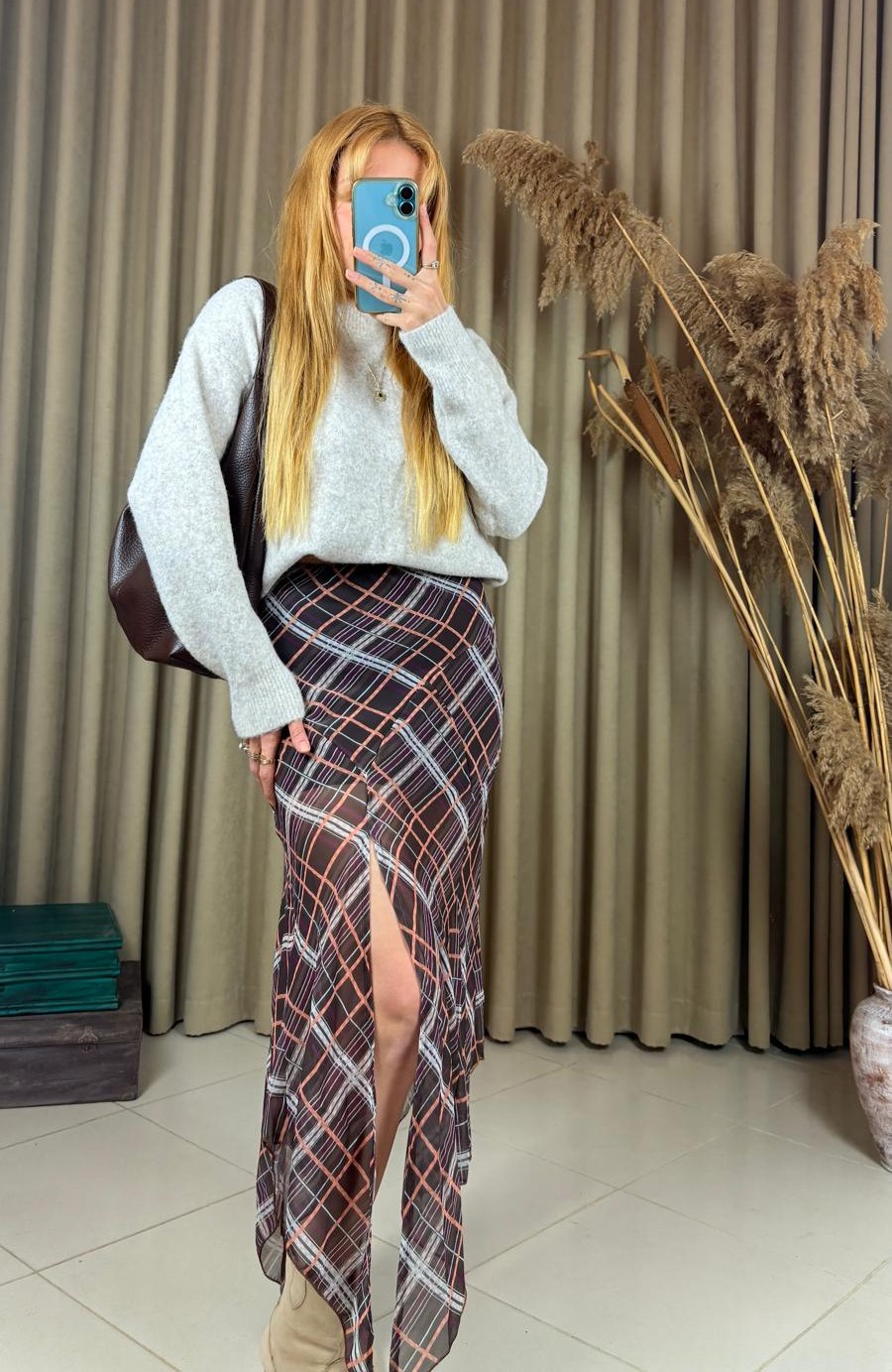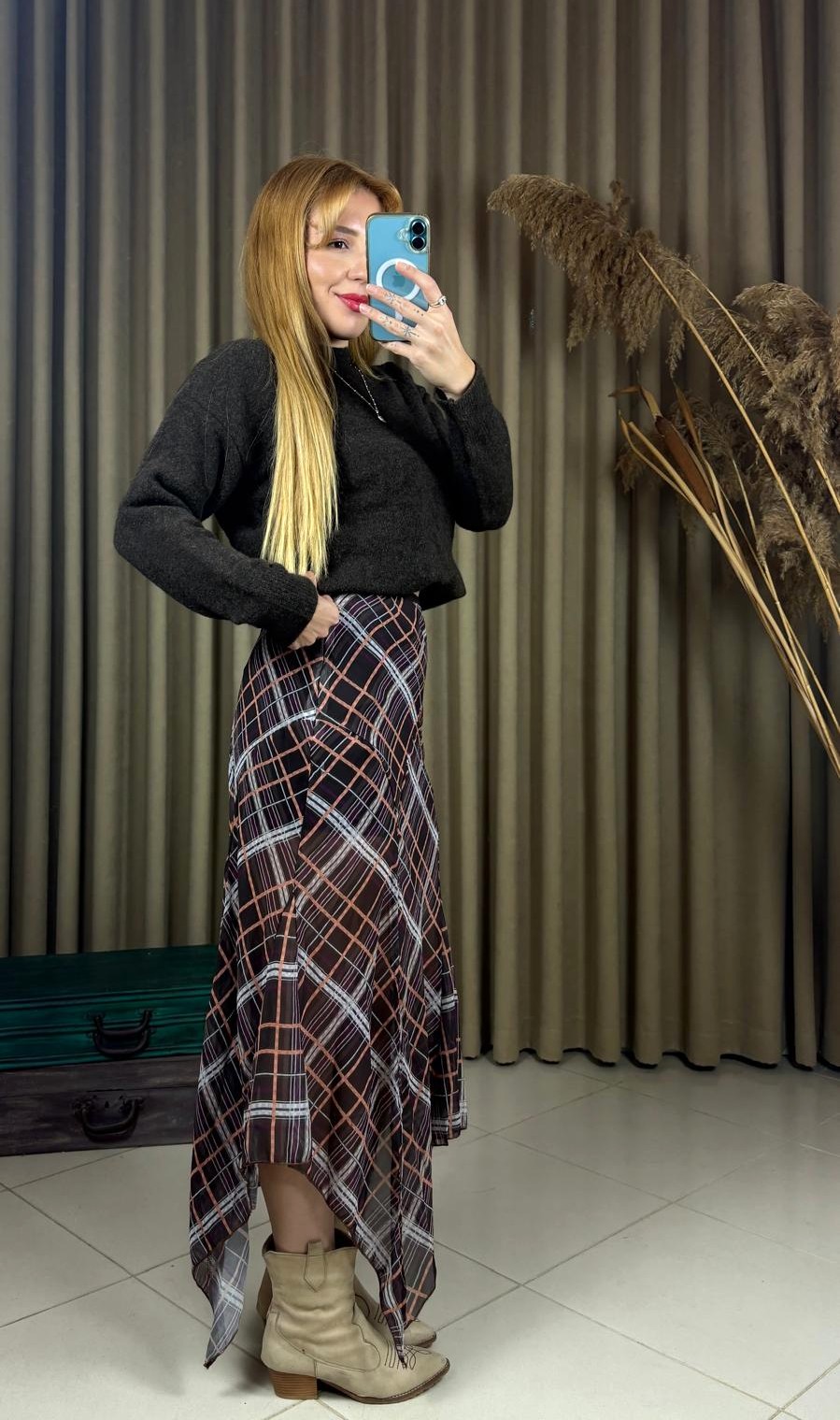 Hafif ve zarif duruşuyla dikkat çeken asimetrik kesim ekose desenli şifon etek, feminen tarzı modern bir dokunuşla buluşturuyor. Akıcı şifon kumaşı ve asimetrik kesimi sayesinde hareket ettikçe zarif bir form kazanır. Ekose deseni ise klasik stilin zamansız şıklığını yansıtır.