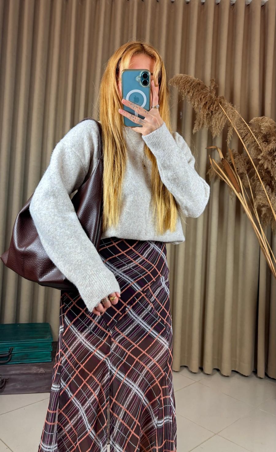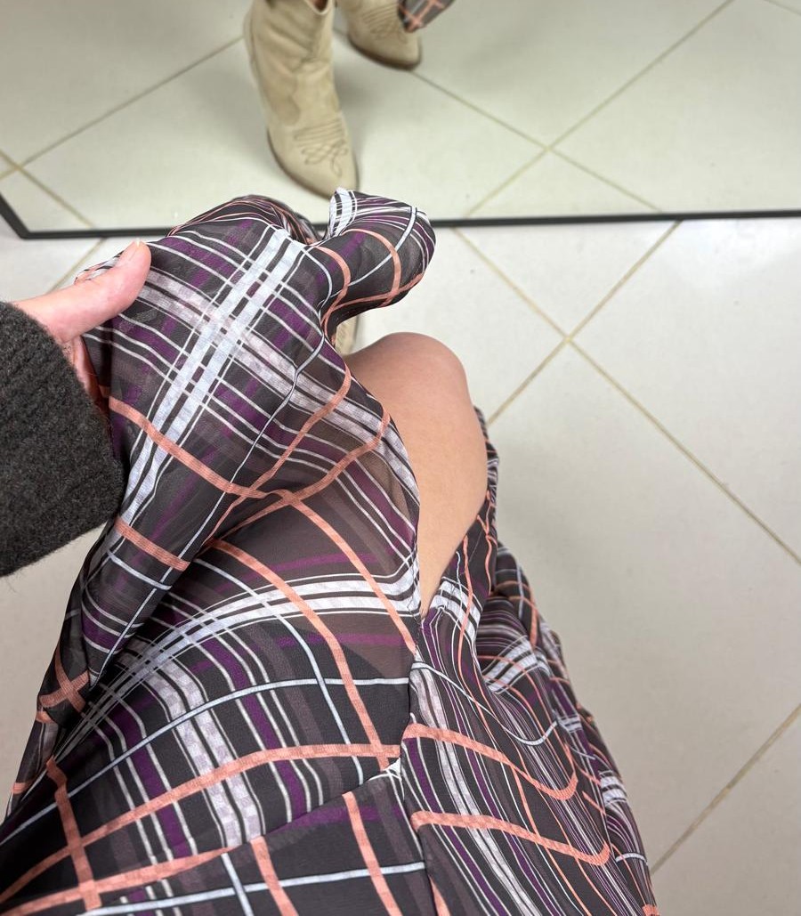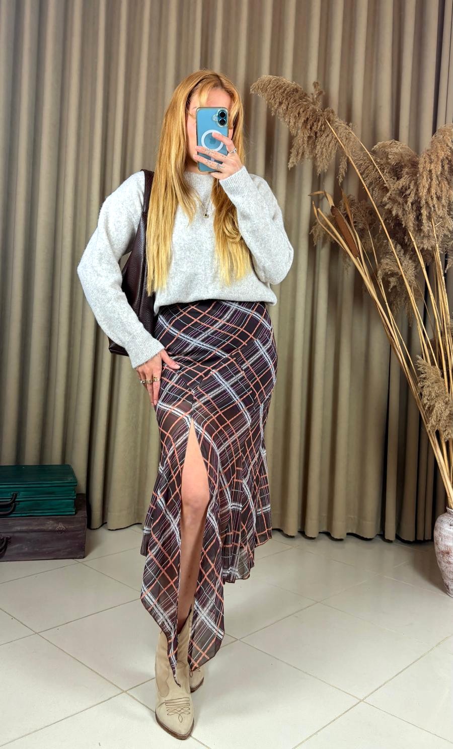 Hafif ve zarif duruşuyla dikkat çeken asimetrik kesim ekose desenli şifon etek, feminen tarzı modern bir dokunuşla buluşturuyor. Akıcı şifon kumaşı ve asimetrik kesimi sayesinde hareket ettikçe zarif bir form kazanır. Ekose deseni ise klasik stilin zamansız şıklığını yansıtır.