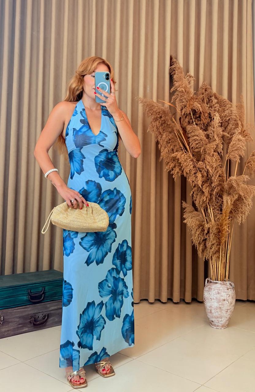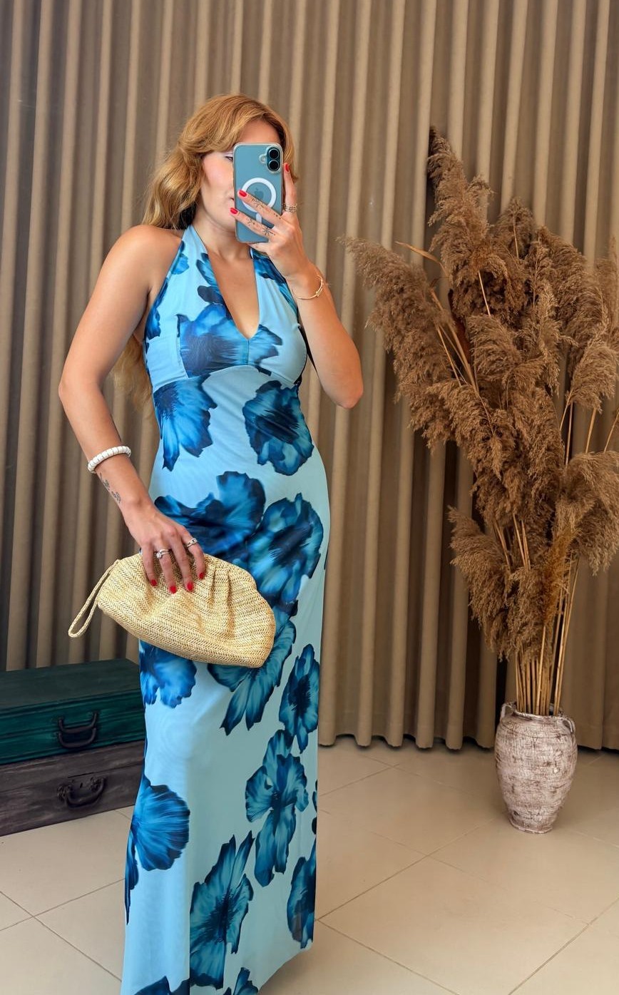 Boyundan Bağlamalı Çiçek Desenli Mavi Elbise