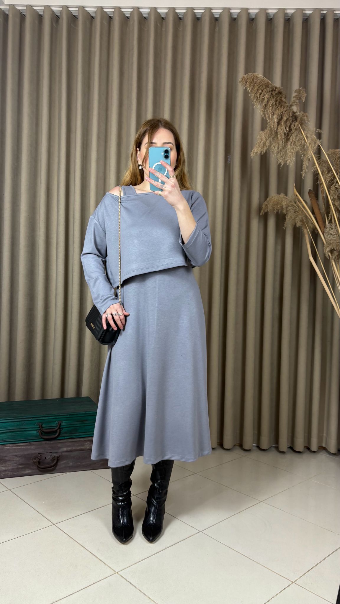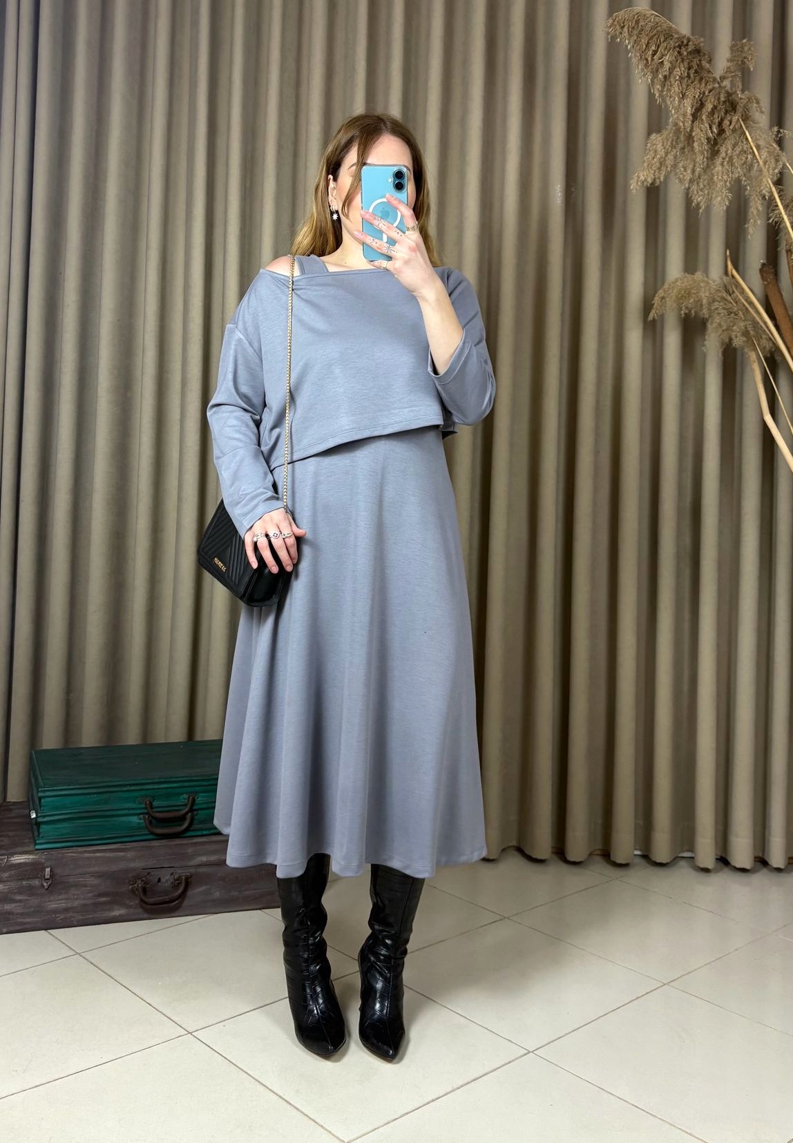 Gri Modal Askılı Elbise Crop Bluz Takım