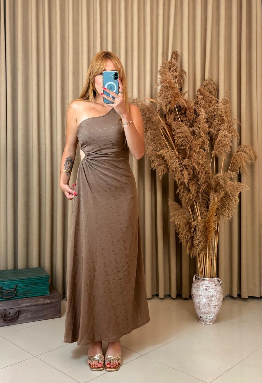 Stil sahibi kadınlar için tasarlanan kahverengi desenli tek kol bel detaylı elbise, modern çizgileri ve rahat kullanımıyla her ortamda dikkat çeker.