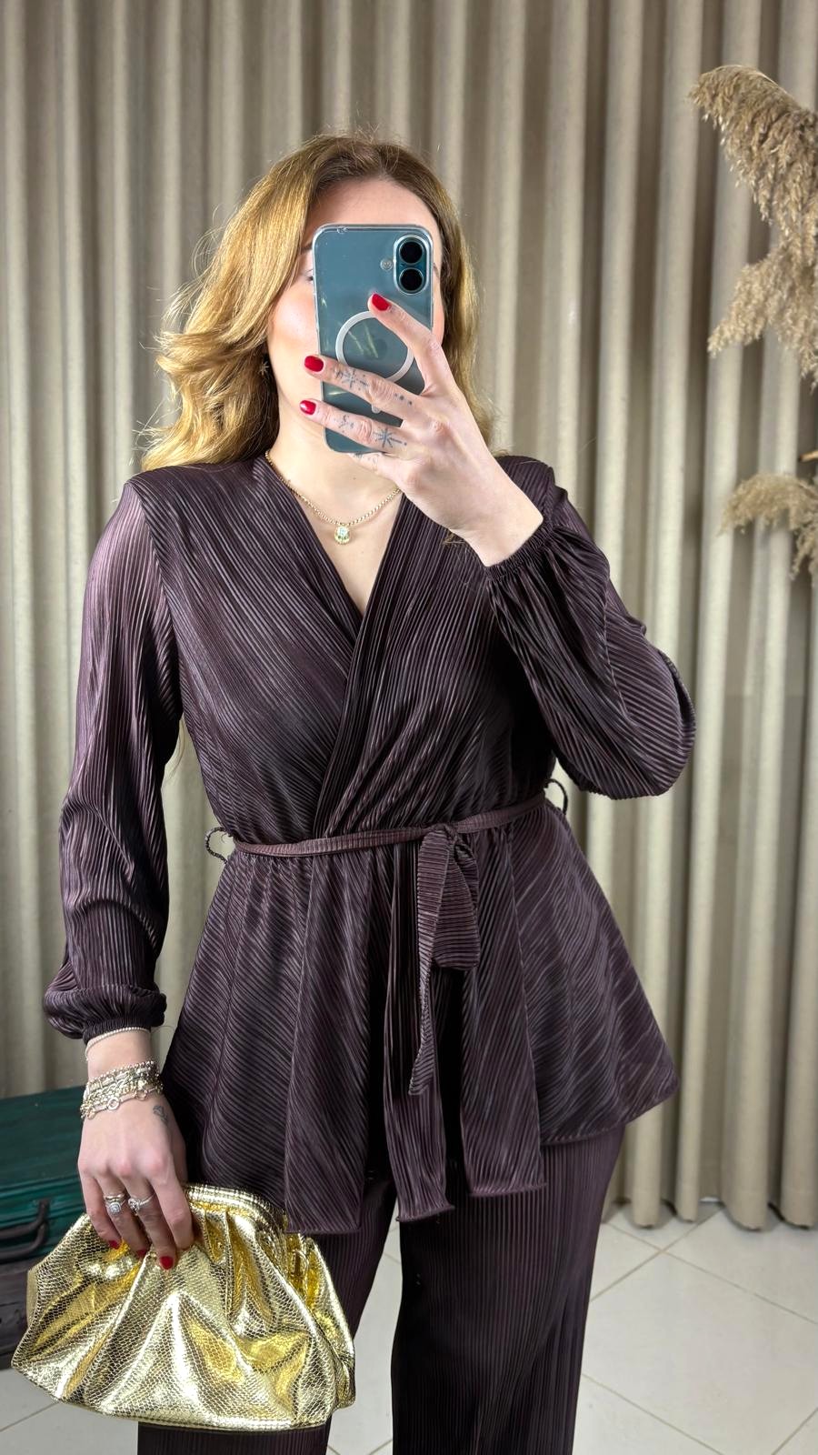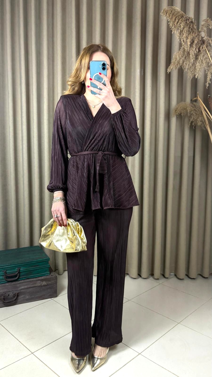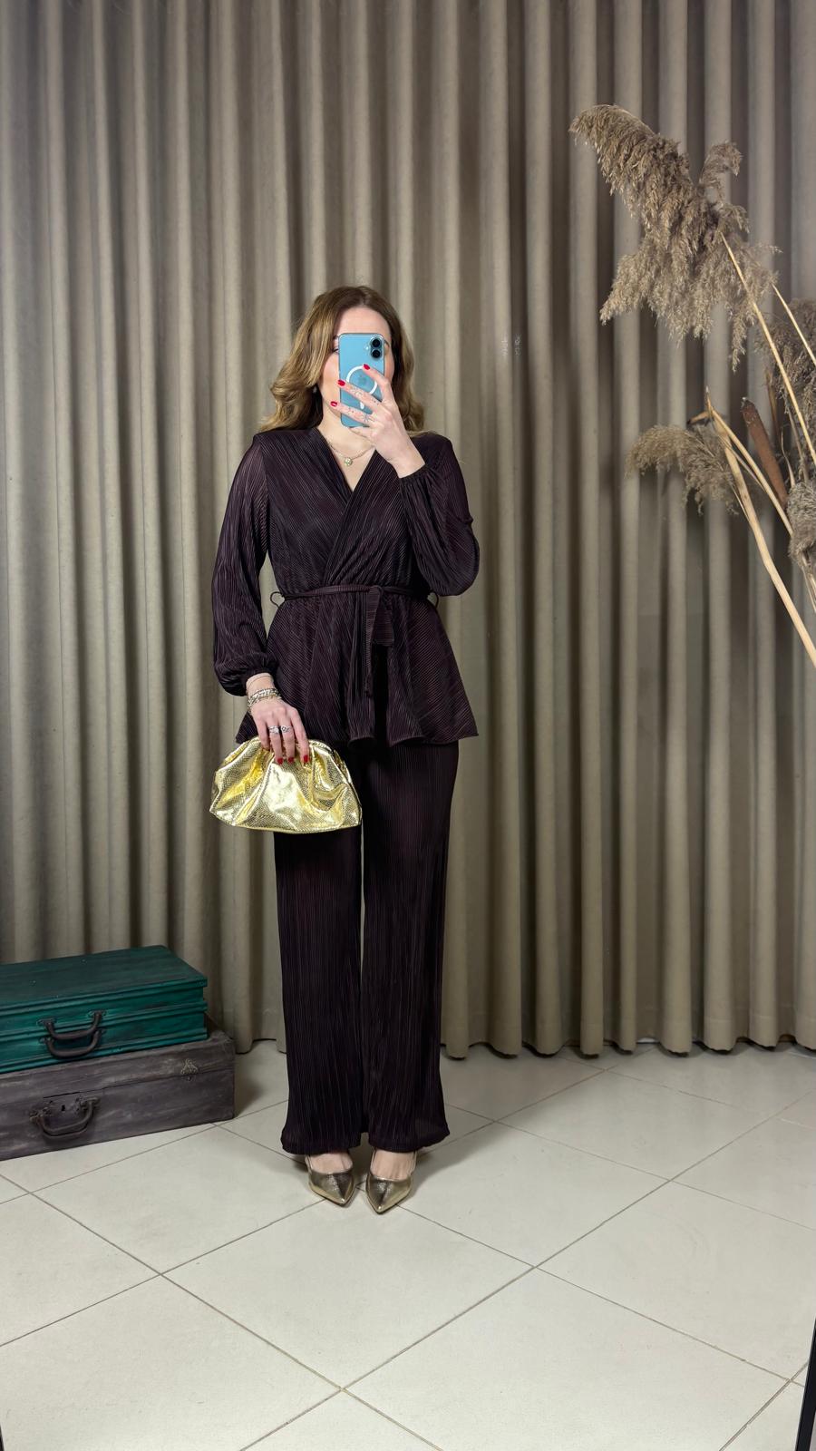 Kahverengi Volanlı Bluz Pantolon Takım