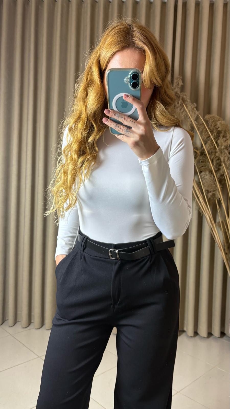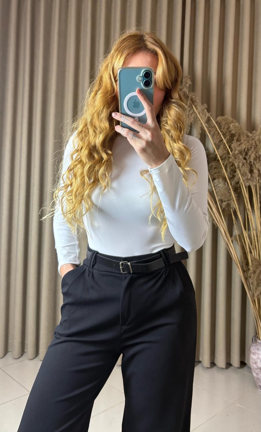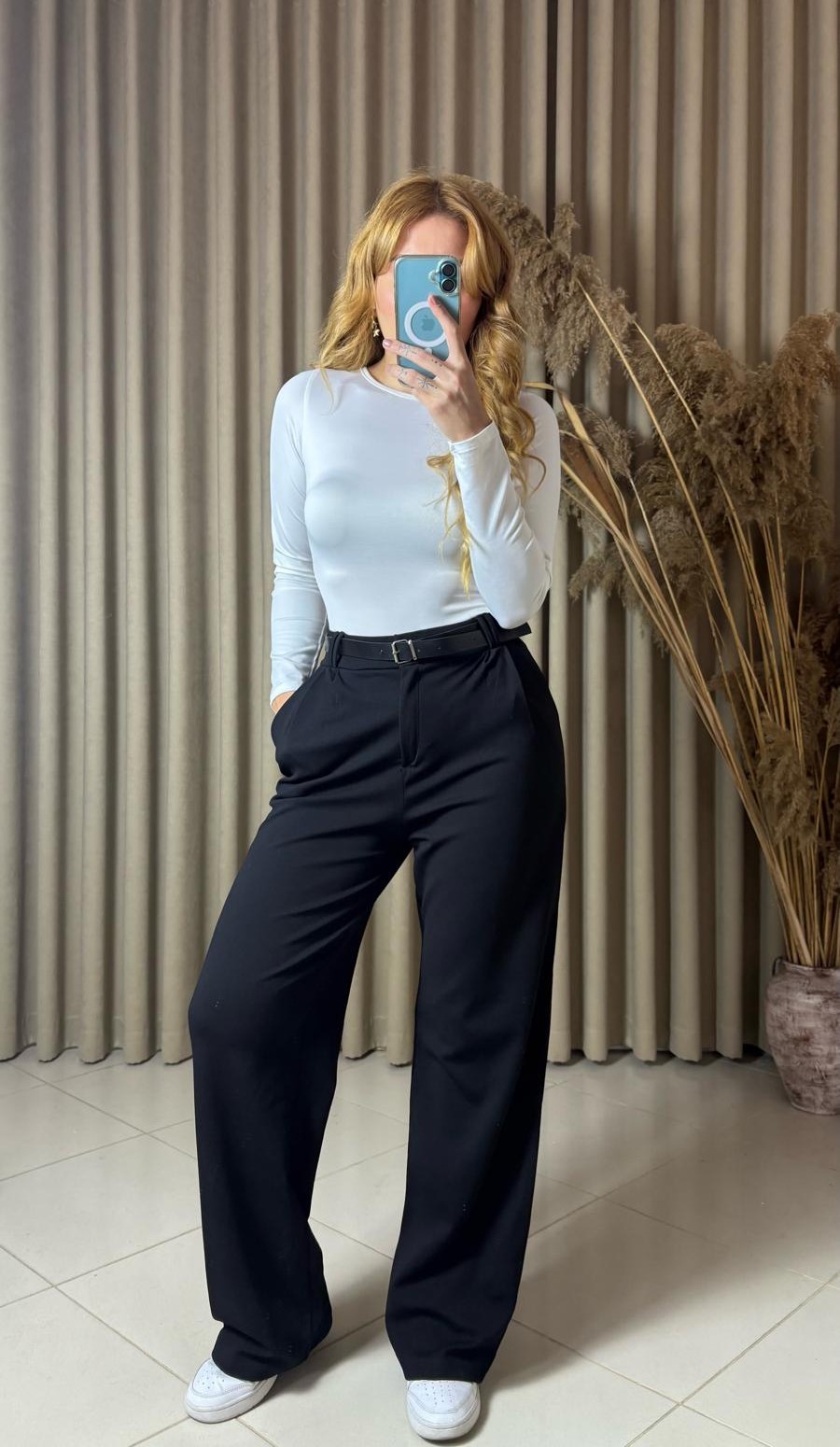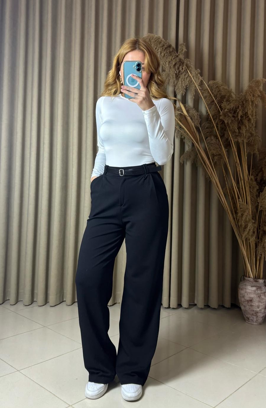 Rahatlık ve şıklığı bir araya getiren kemerli likralı siyah palazzo pantolon, modern görünümüyle gardırobunuzun vazgeçilmez parçalarından biri olacak. Esnek yapısı sayesinde gün boyu konfor sağlarken, yüksek bel ve kemer detayı ile belinizi vurgular, zarif bir siluet oluşturur.