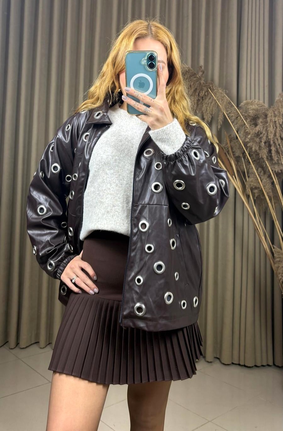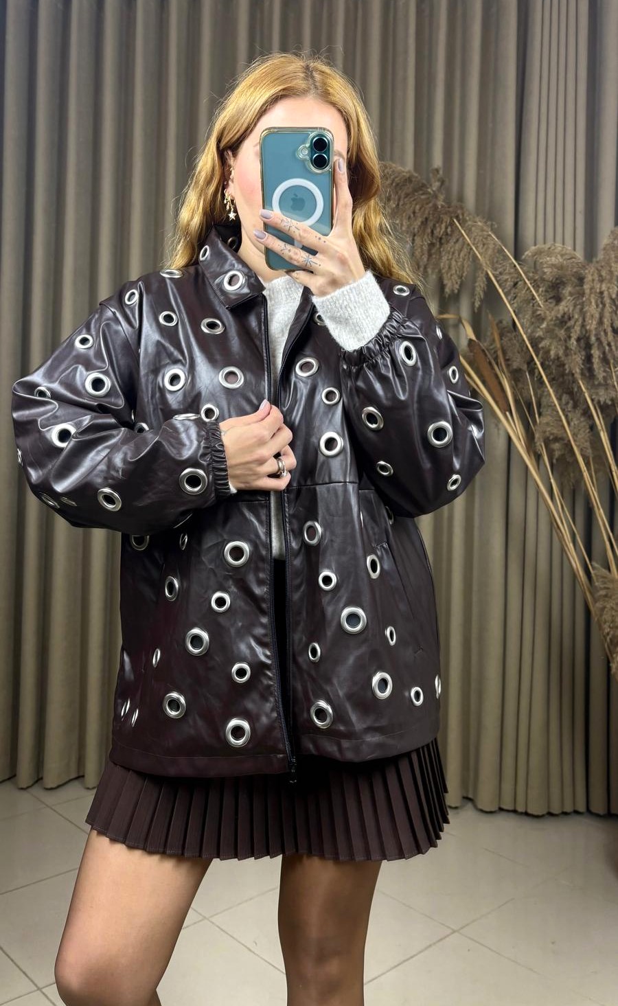 Tarzınızı güçlü bir dokunuşla tamamlayın! Kuş gözü detaylı tasarım oversize kahverengi deri ceket, modern ve iddialı görünümüyle sezonun favori parçalarından biri. Oversize kesimi sayesinde rahat bir duruş sunarken, kuş gözü metal detayları cekete özgün ve şık bir karakter kazandırır.