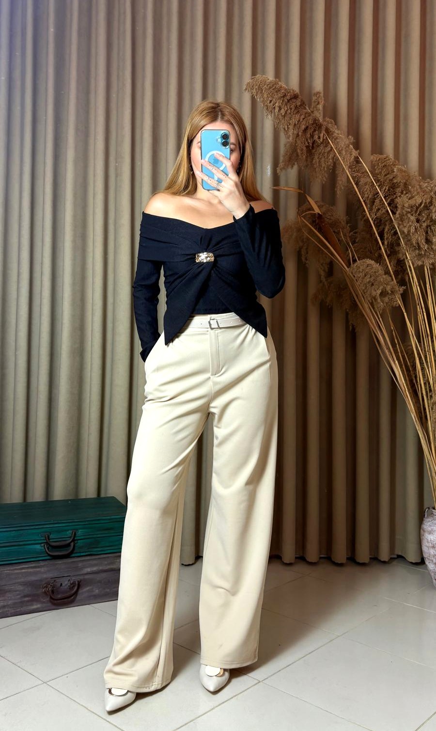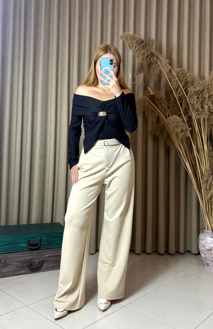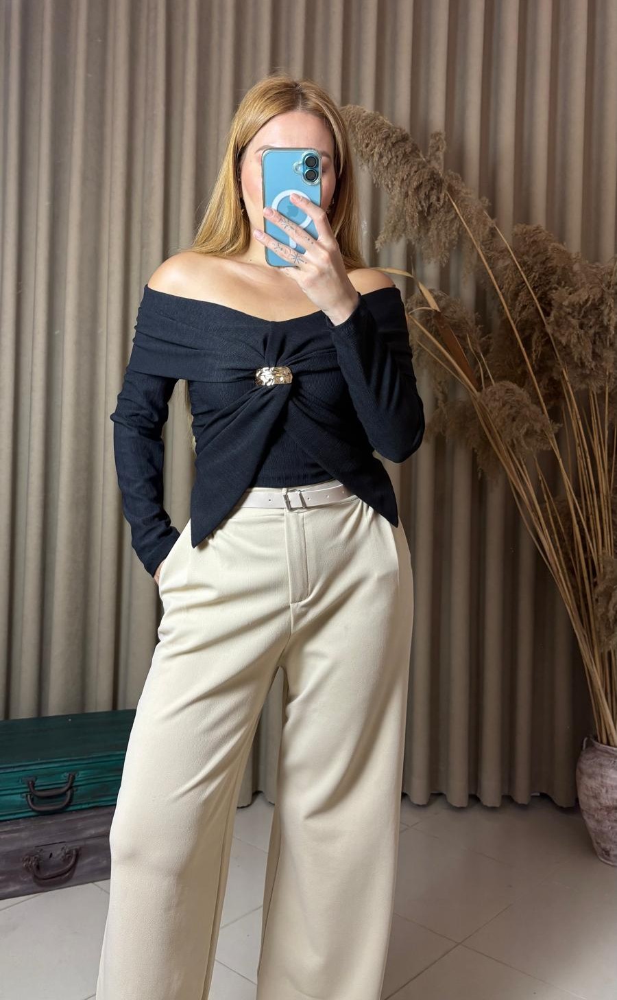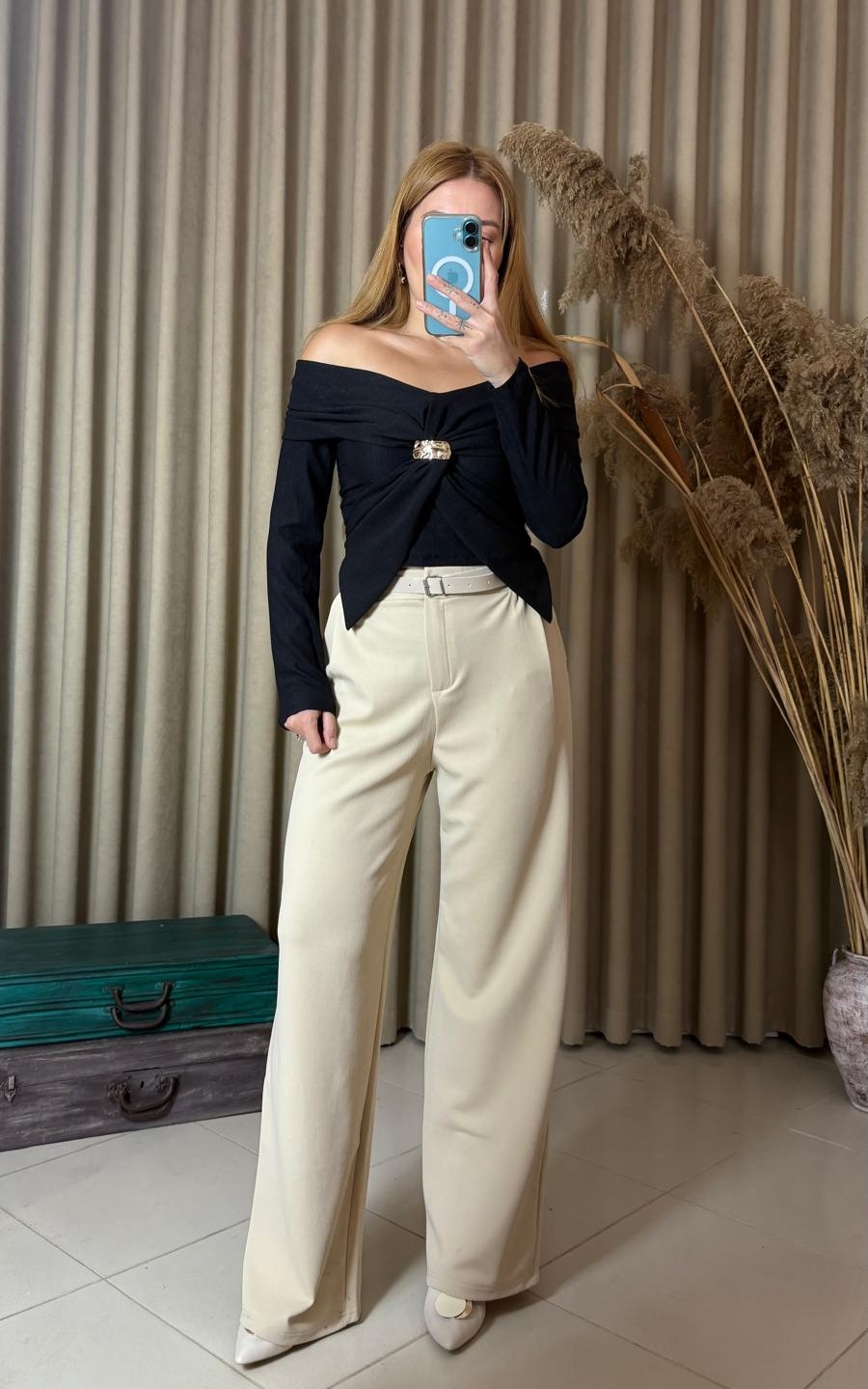 Şıklığı ve modern tasarımı bir araya getiren Madonna yaka gold aksesuar detaylı bluz, zarif görünüm arayan kadınların favorisi olmaya aday. Özel günlerde, davetlerde veya günlük kombinlerinizde rahatlıkla kullanabileceğiniz bu bluz, feminen çizgisiyle tarzınızı ön plana çıkarır.