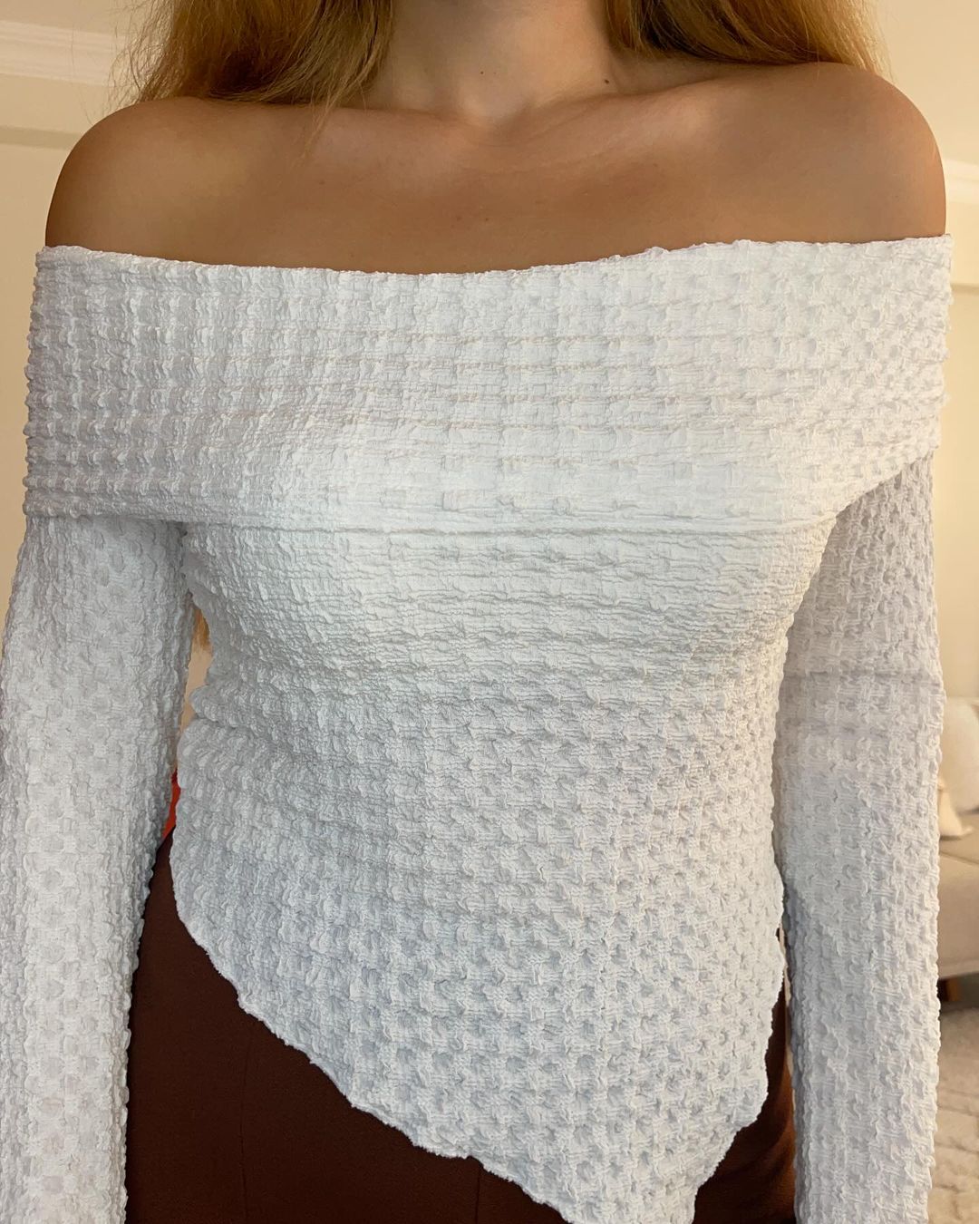 Madonna Yaka Kabartmalı Asimetrik Kesim Beyaz Bluz
