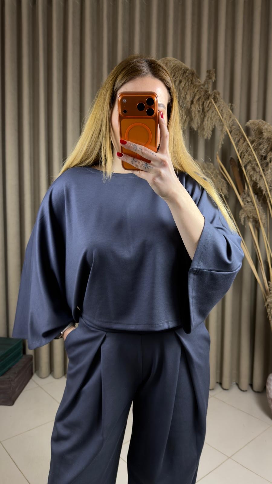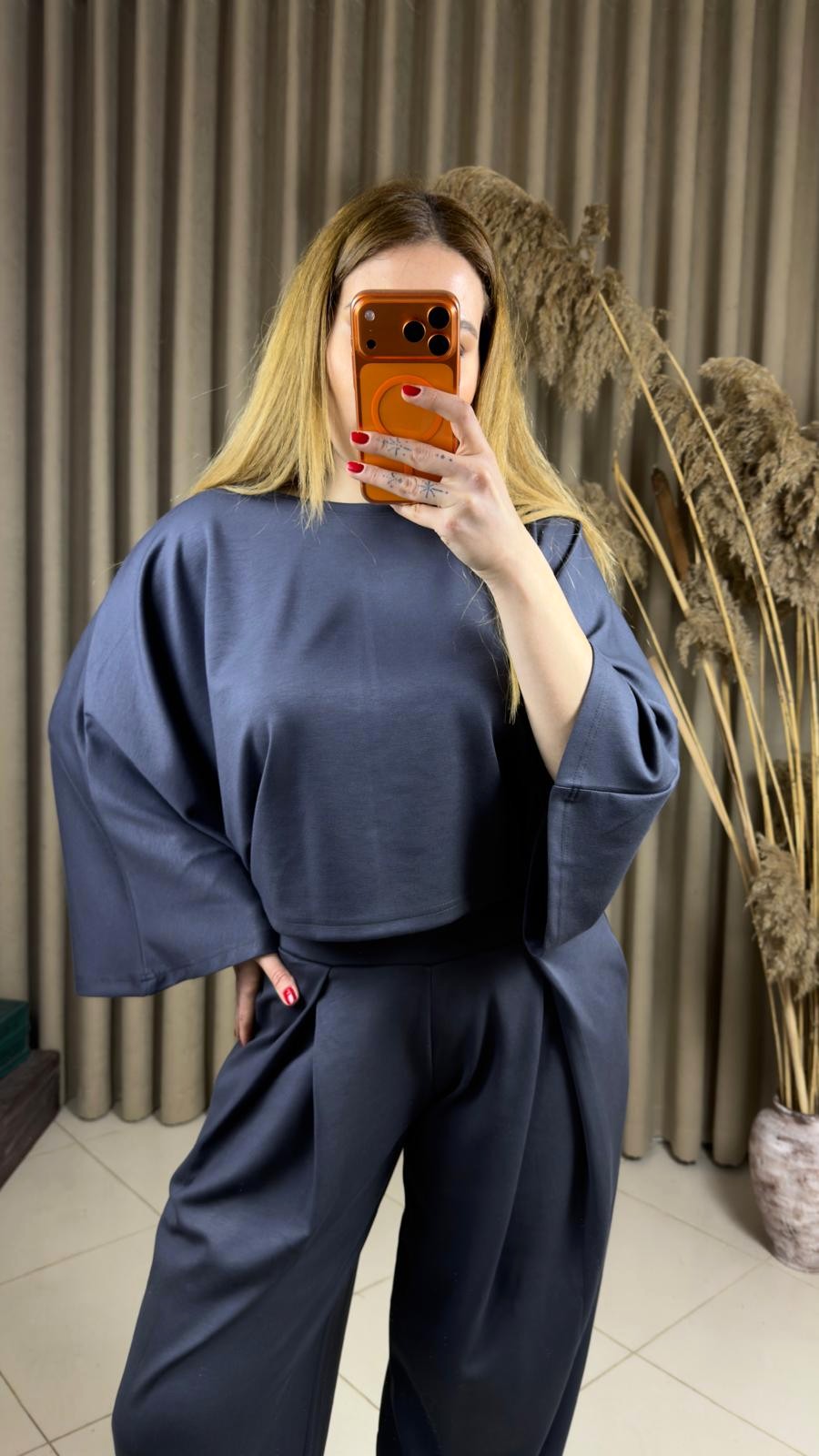 Modal Yarasa Kol Bluz Pileli Şalvar Takım Antrasit
