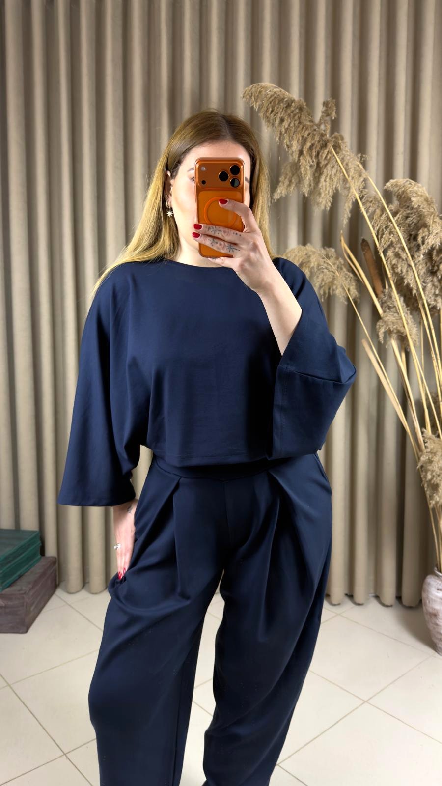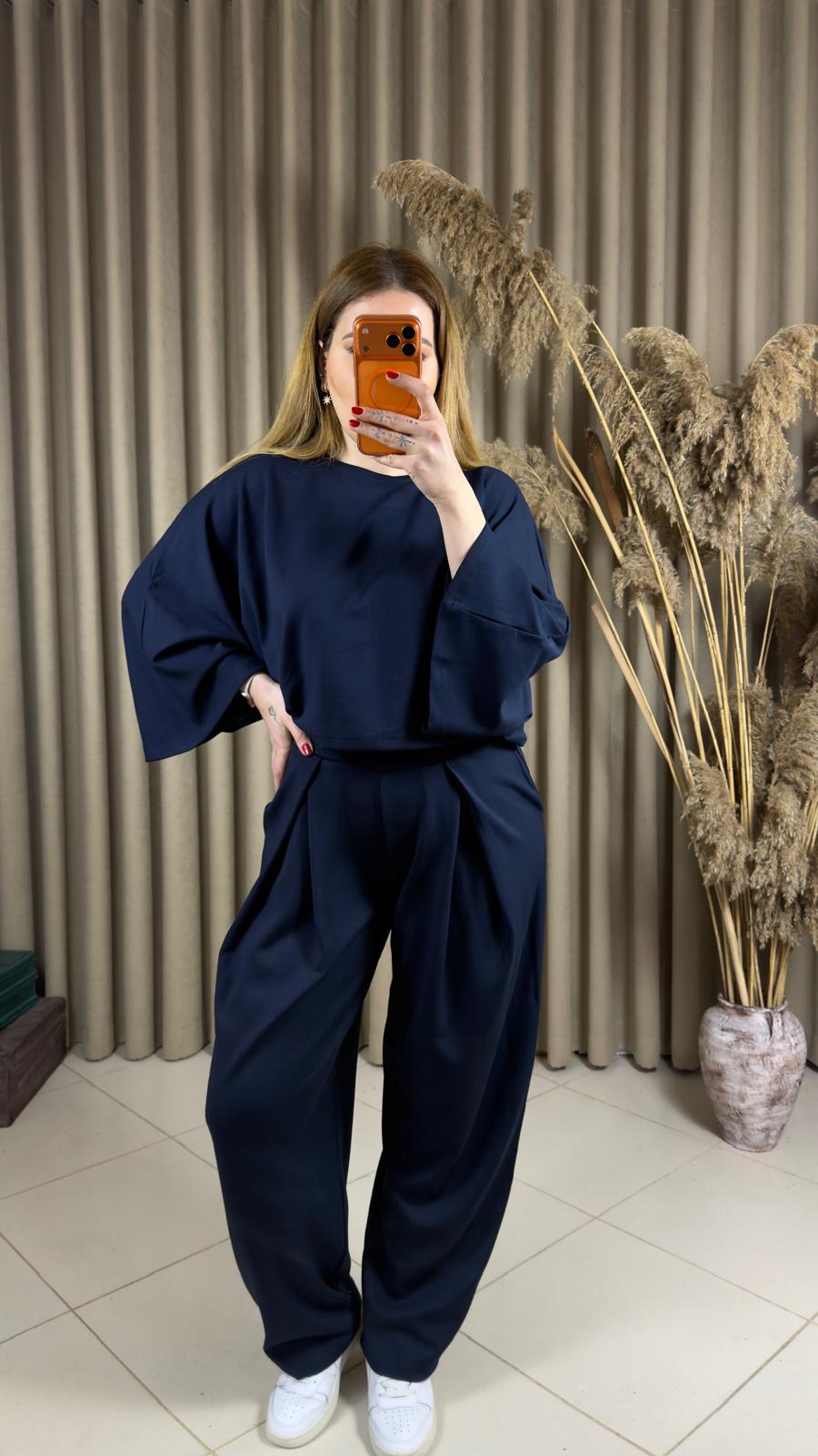 Modal Yarasa Kol Bluz Pileli Şalvar Takım Lacivert