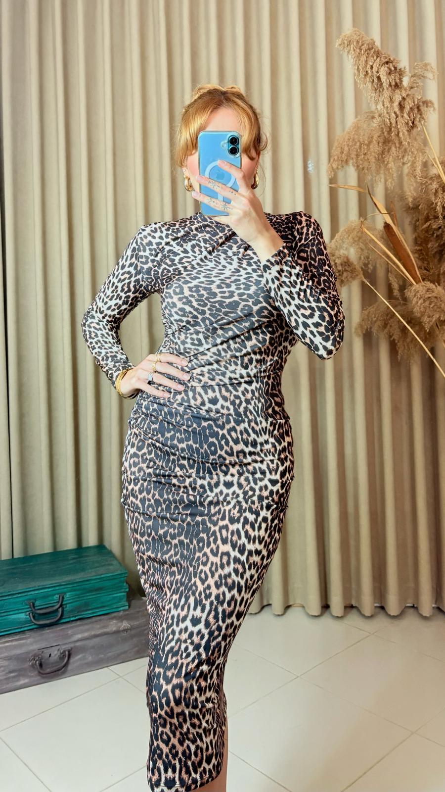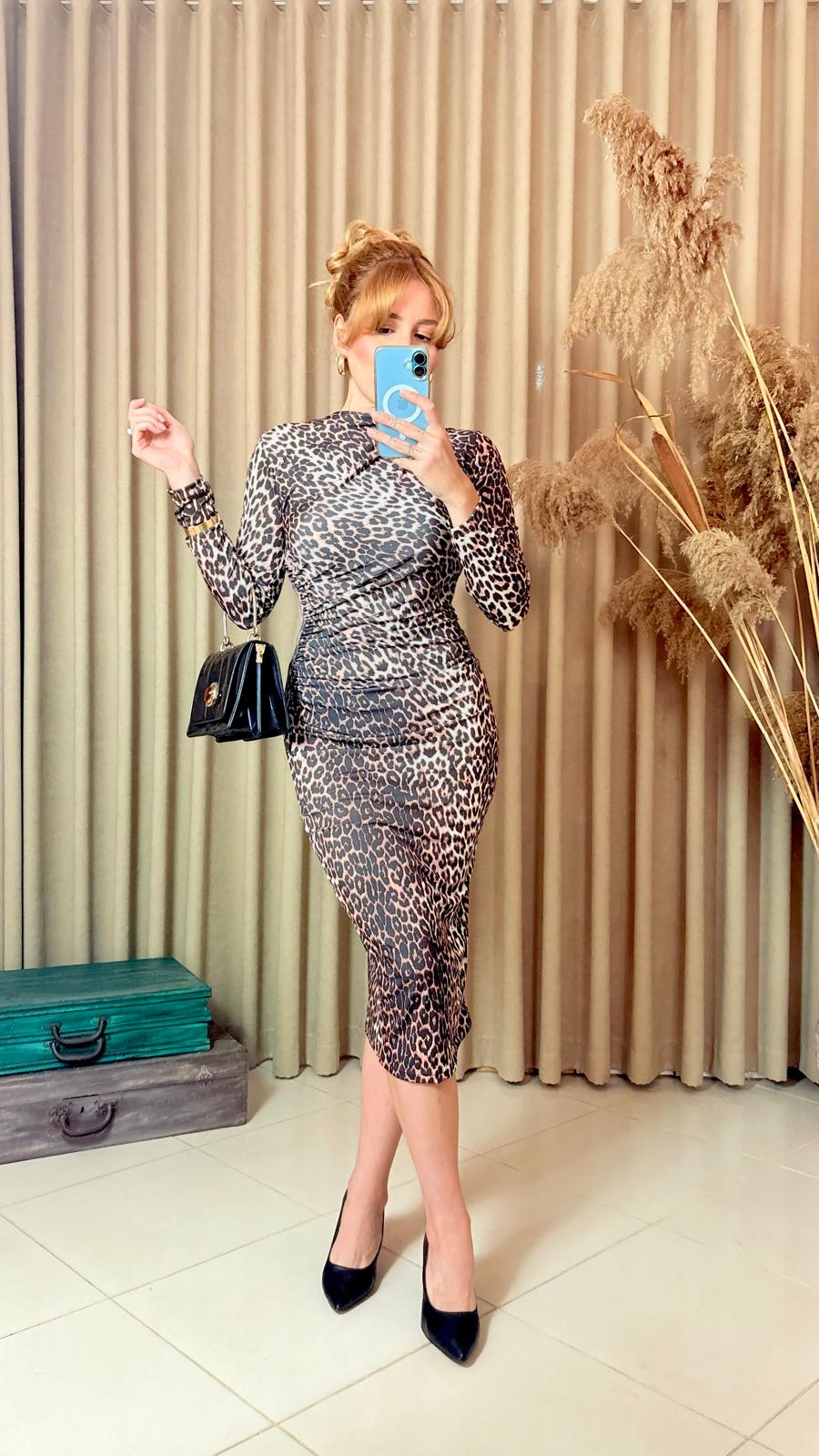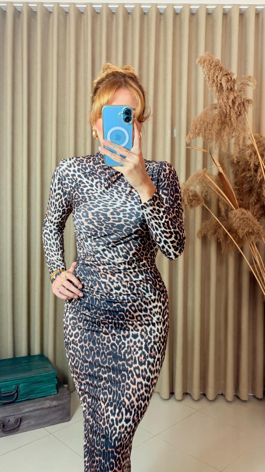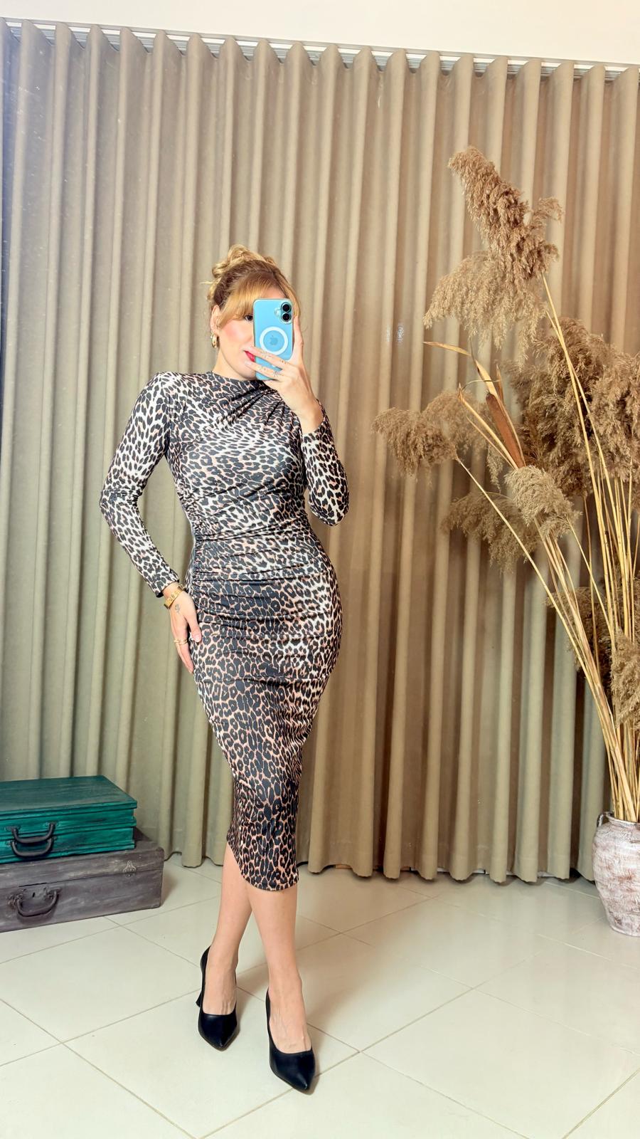 Vücut hatlarını zarifçe ortaya çıkaran leopar desenli uzun kol elbise, ful likralı kumaşı sayesinde hem şık hem de rahat bir kullanım sunar. Özel günler, davetler ve gece kombinleri için tasarlandı.