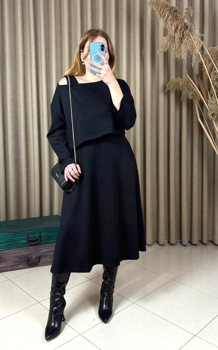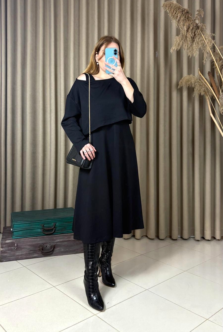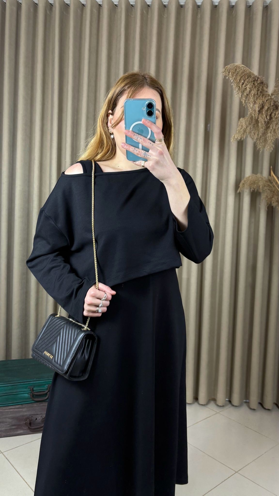 Siyah Modal Askılı Elbise Crop Bluz Takım