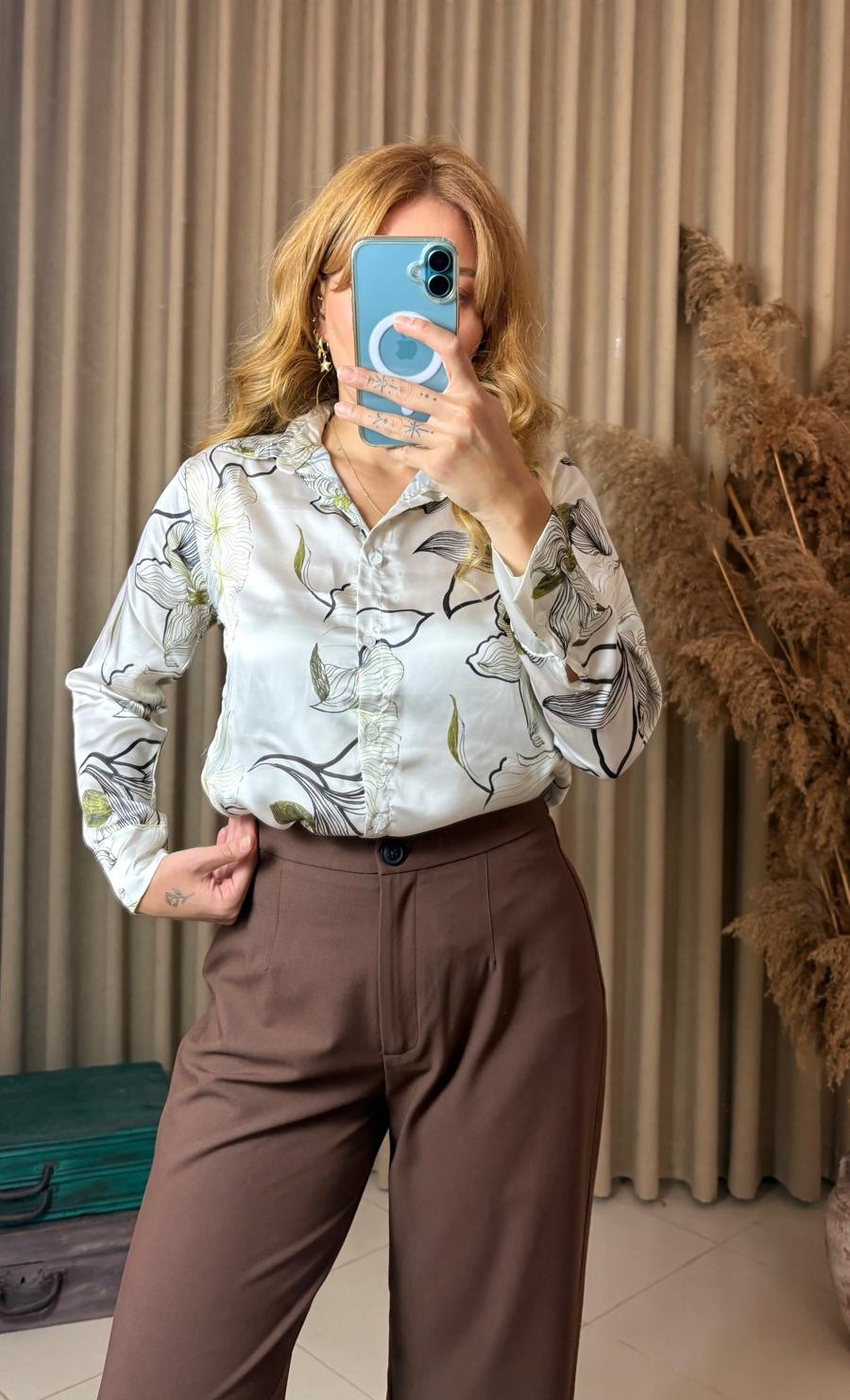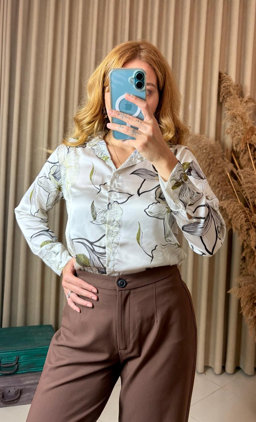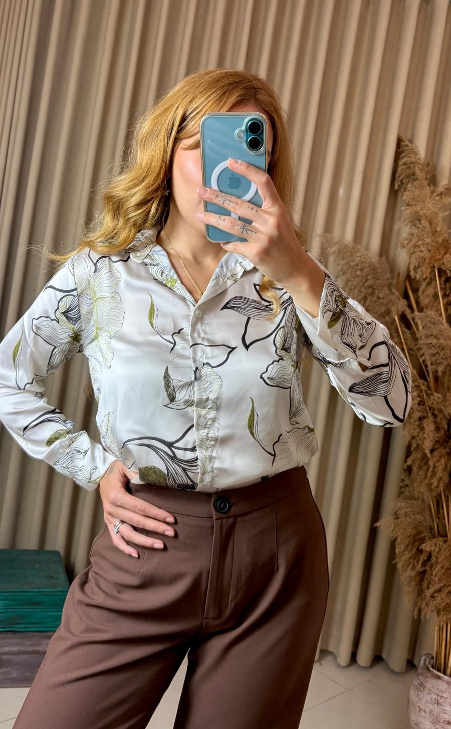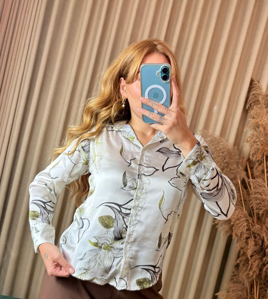 Feminen çiçek desenleri ve parlak saten dokusuyla öne çıkan siyah yeşil çiçekli pamuk saten gömlek, hem günlük hem de ofis kombinlerinizde zarif bir şıklık sunar.