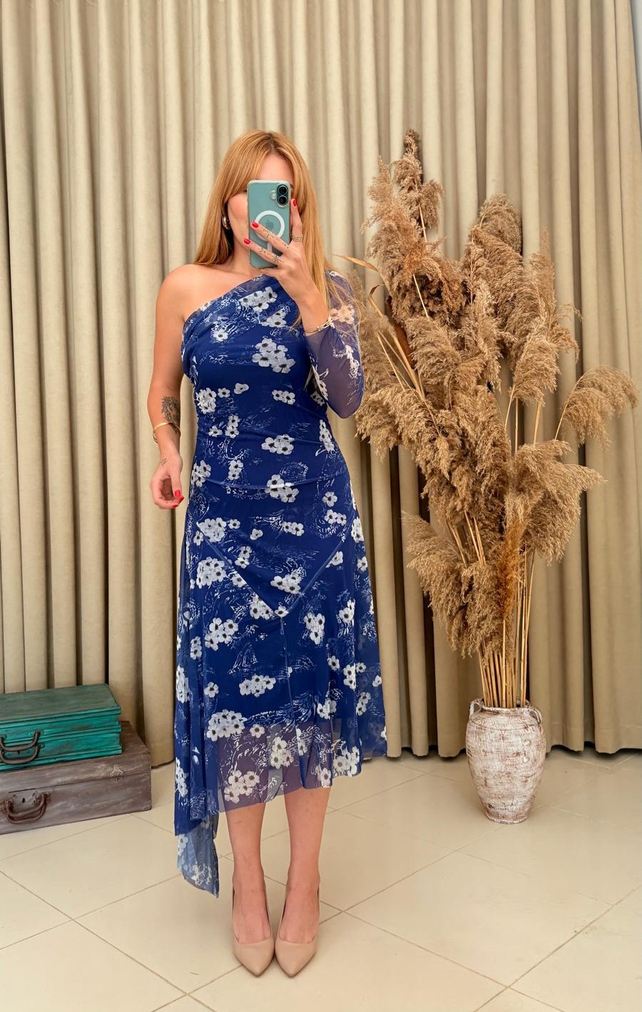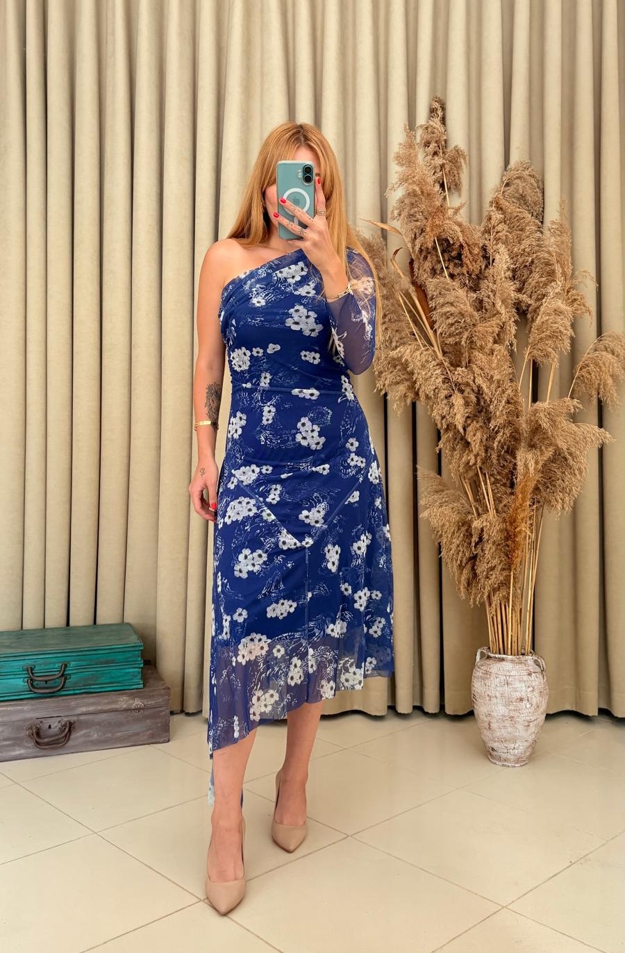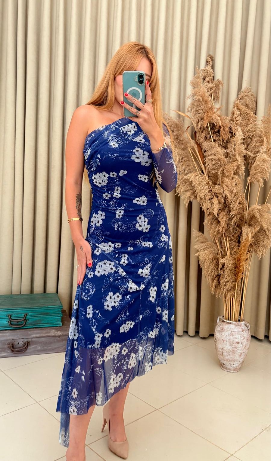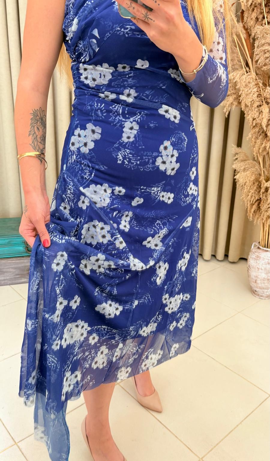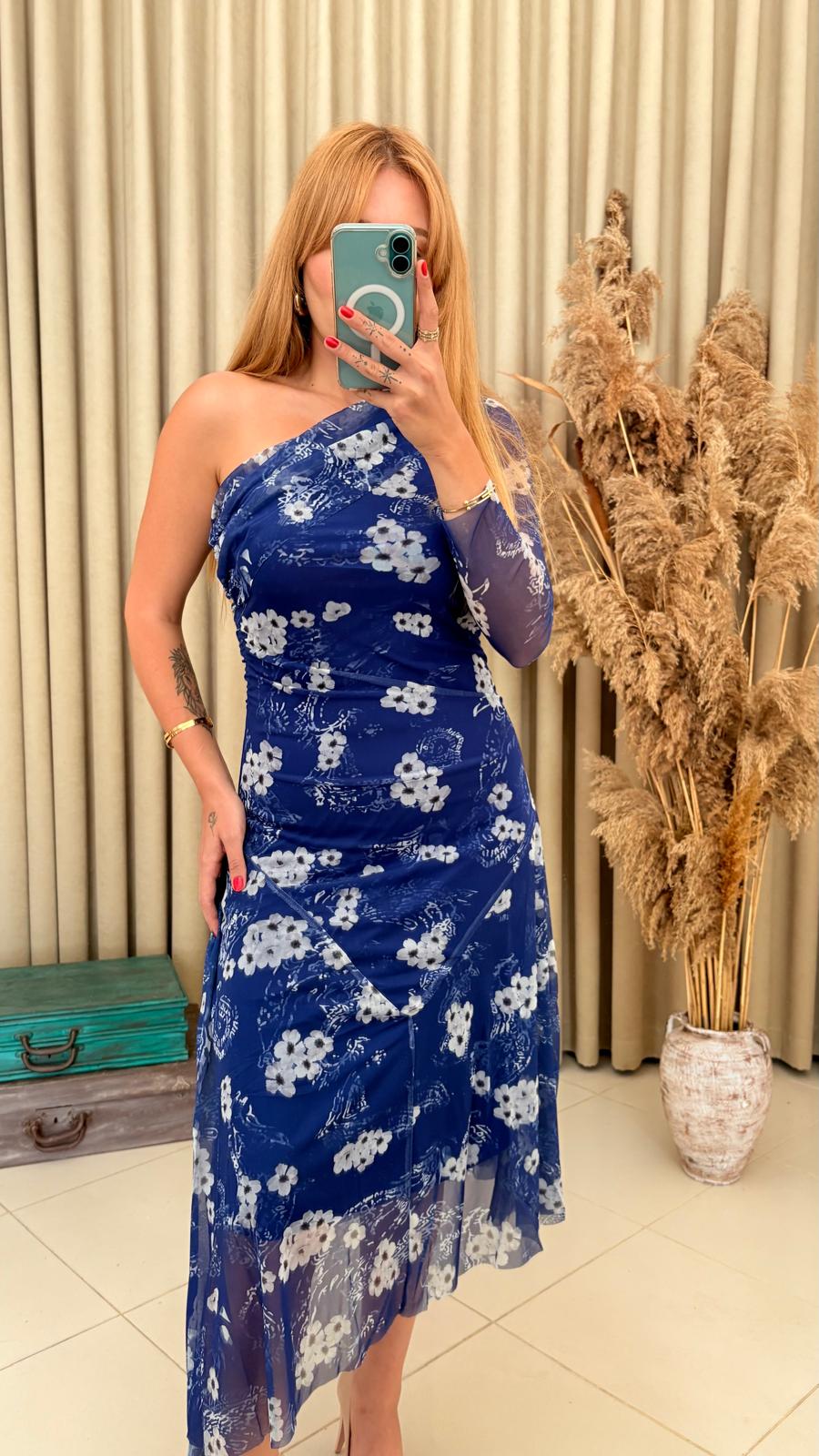 Zarafeti ve feminen detayları bir araya getiren tek kol çiçek desenli asimetrik lacivert tül elbise, davetlerde ve özel kutlamalarda şıklığınızı ön plana çıkarır.
