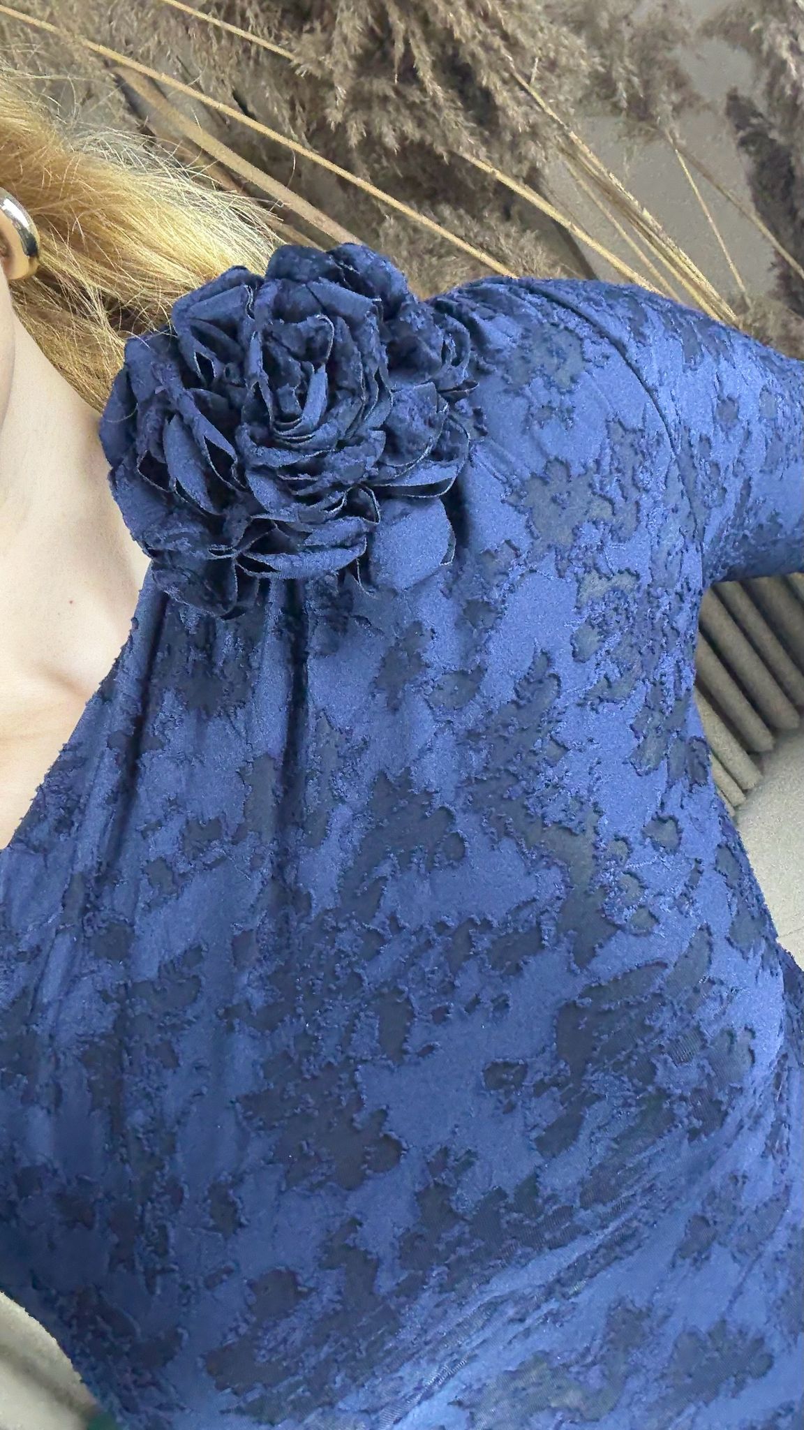 Zarafeti modern bir dokunuşla buluşturan tek omuz çiçek aksesuarlı lacivert elbise, şık görünüm arayanların favorisi olmaya aday. Tek omuz tasarımı feminen bir siluet oluştururken, omuzdaki çiçek aksesuarı elbiseye hareket ve sofistike bir detay katar.